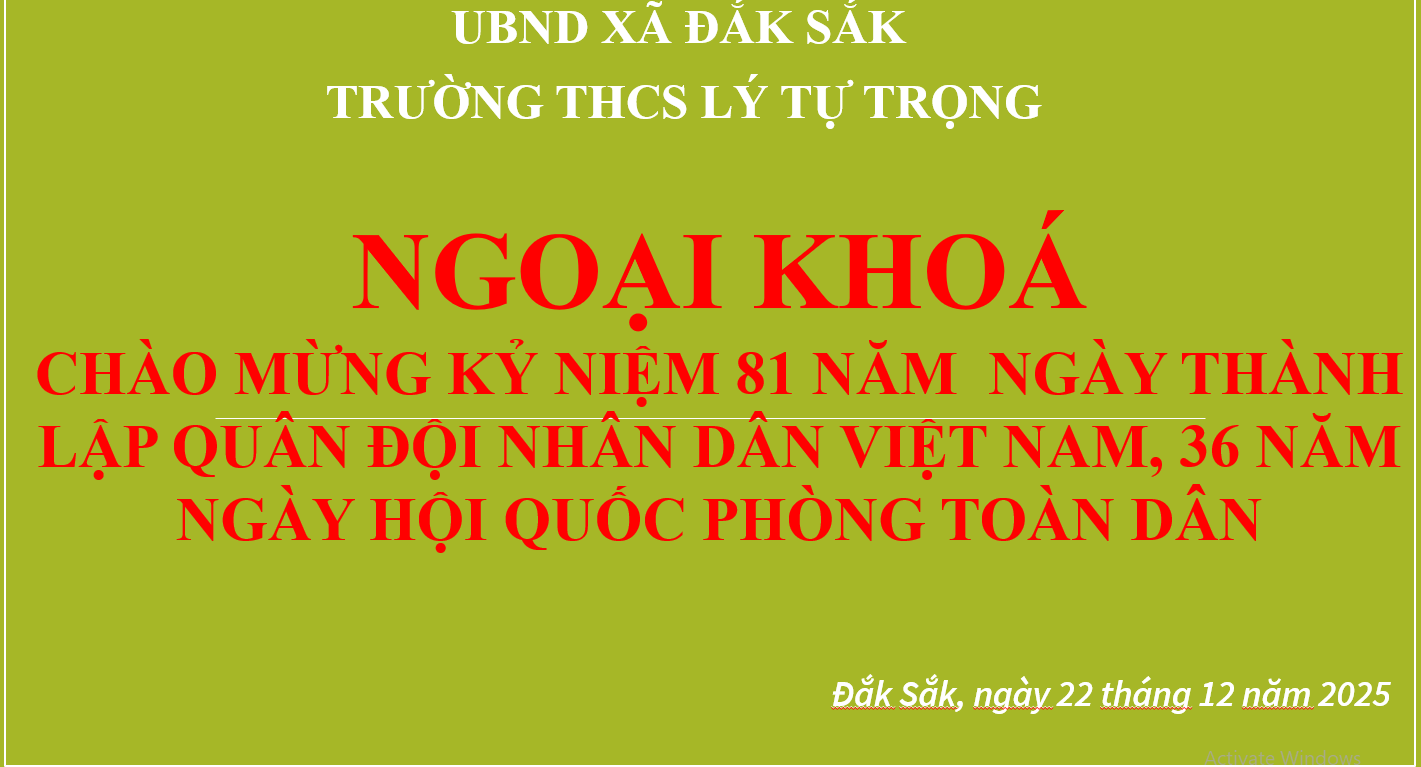 Trường THCS Lý Tự Trọng đã tổ chức buổi ngoại khóa chào mừng kỷ niệm 81 năm Ngày thành lập Quân đội nhân dân Việt Nam (22/12/1944 – 22/12/2025) và 36 năm Ngày hội Quốc phòng toàn dân.