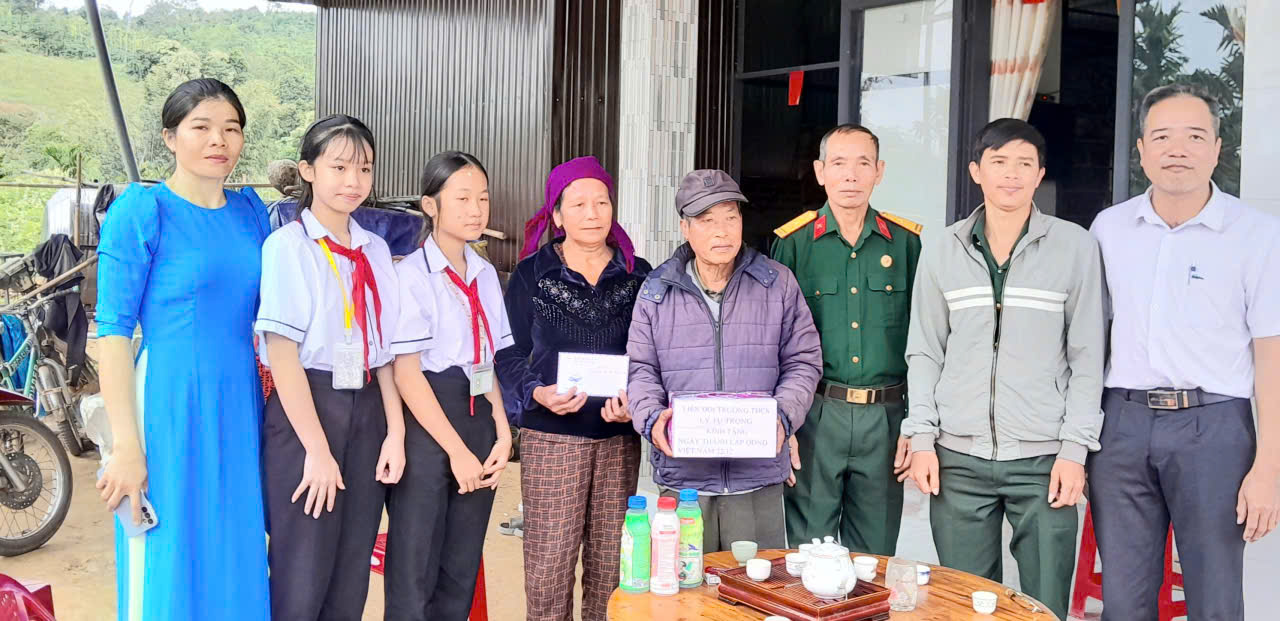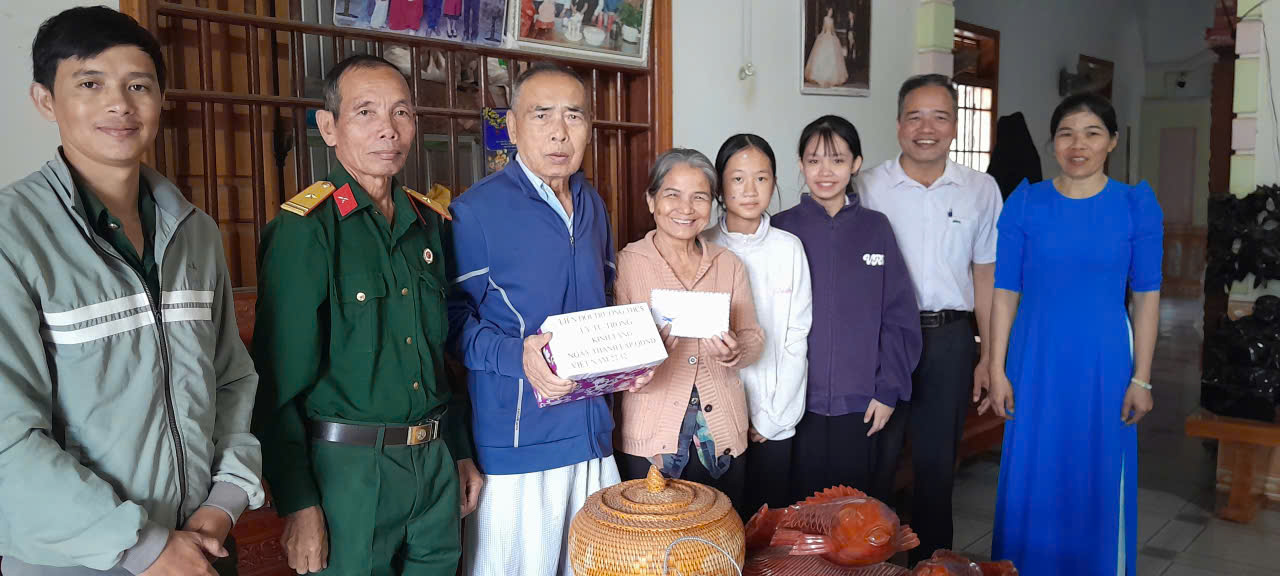 Bên cạnh hoạt động tuyên truyền, giáo dục truyền thống, nhà trường đã tổ chức thăm hỏi và trao tặng những phần quà ý nghĩa đến các cựu chiến binh có công với cách mạng trên địa bàn xã. Đây là hoạt động thiết thực nhằm thể hiện đạo lý “Uống nước nhớ nguồn”, “Đền ơn đáp nghĩa”, đồng thời giáo dục học sinh lòng biết ơn sâu sắc đối với những thế hệ cha anh đã hy sinh, cống hiến vì độc lập, tự do của dân tộc.